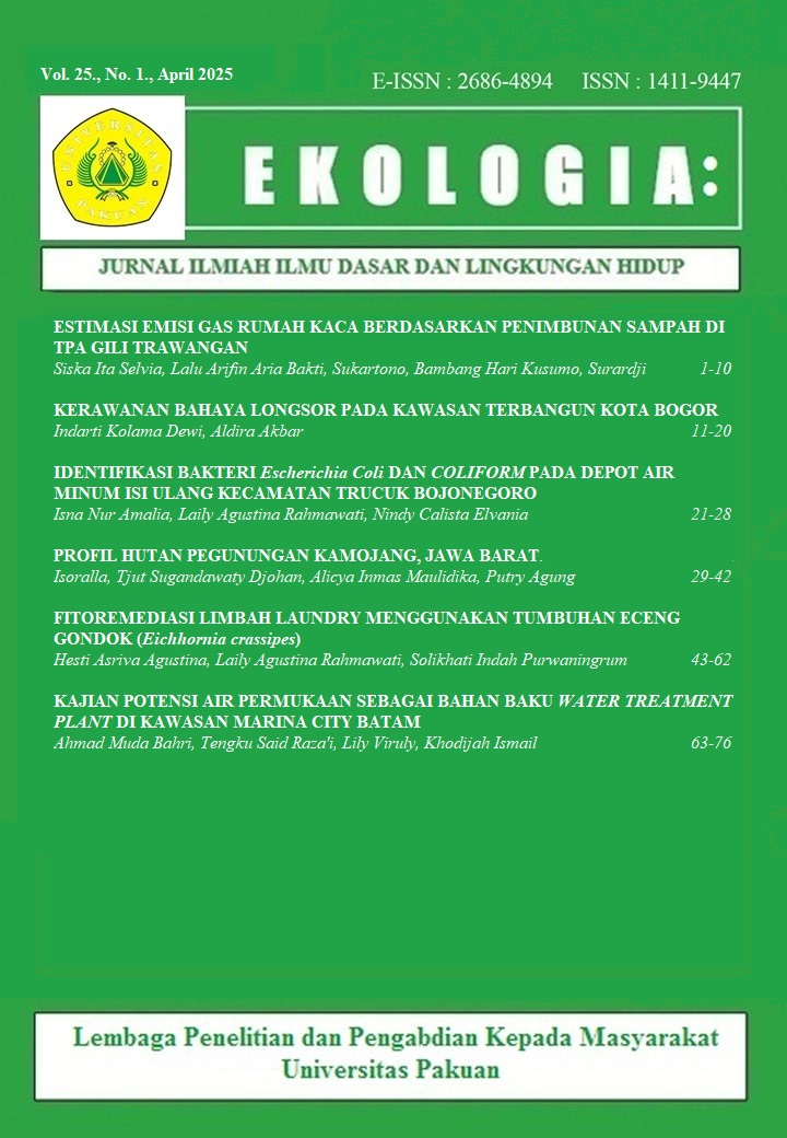 Ekologia adalah jurnal ilmiah yang diterbitkan untuk mengakomodasi tulisan hasil penelitian bagi sivitas akademika Universitas Pakuan khususnya dan instansi lain di luar Universitas Pakuan pada umumnya. Jurnal ini memuat artikel primer yang bersumber langsung dari hasil penelitian Ilmu Dasar dan Lingkungan Hidup.